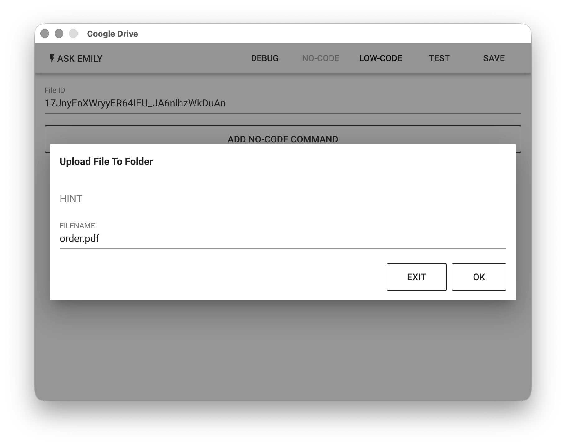 Provides no-code commands such as: "Upload File to Folder" and "Download File from Folder". For example, upload the order.pdf file from the working folder to a specified Google Drive folder.