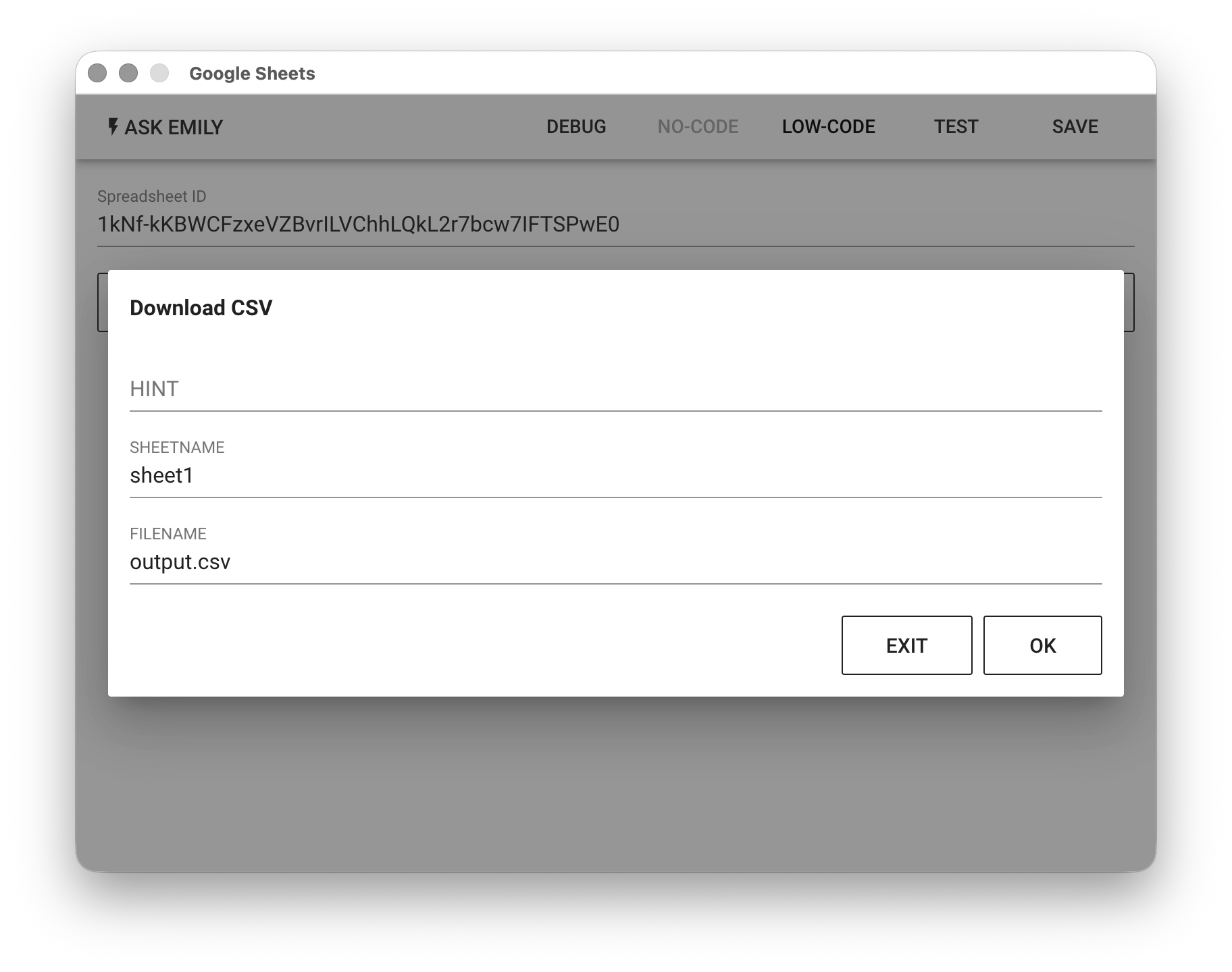 Provides no-code commands such as: "Download XLSX" and "Download CSV". For example, download the sheet1 sheet from the specified Google Spreadsheet file to the output.csv file in the working folder.