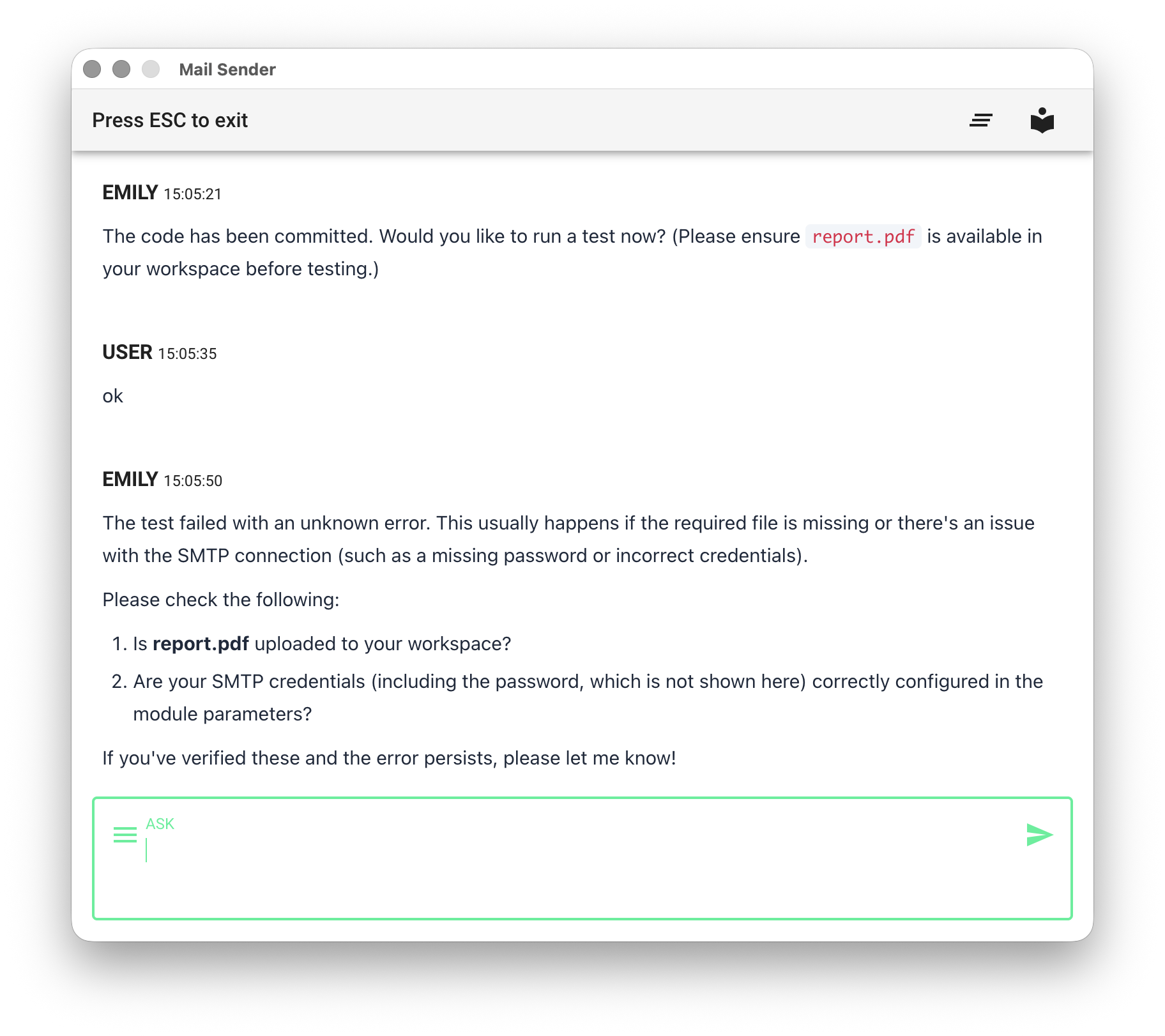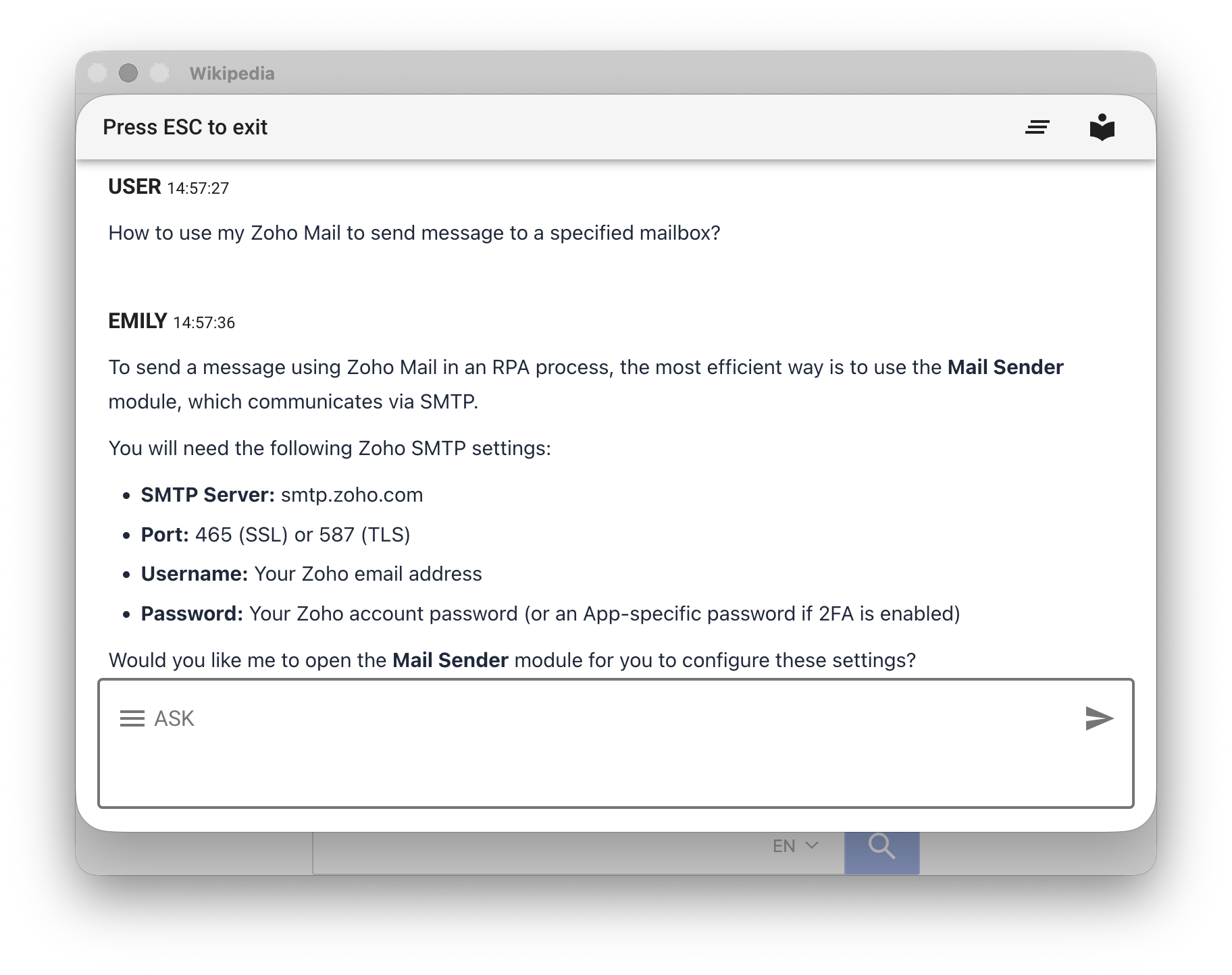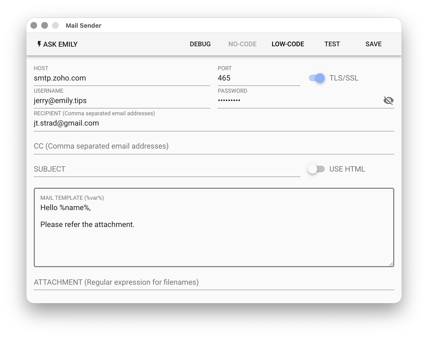 Most modules provide a No-Code editor for editing module parameters or commands. For example, with the "Send Email" module, if the rules don't vary much, users can directly configure email parameters in the No-Code editor. If a field hint shows %VAR% or %FILENAME%, it means the field accepts variables, where the variable name corresponds to the base filename of a document in the working folder. For example, the content of %name% will be replaced with the content of name.txt in the working folder.