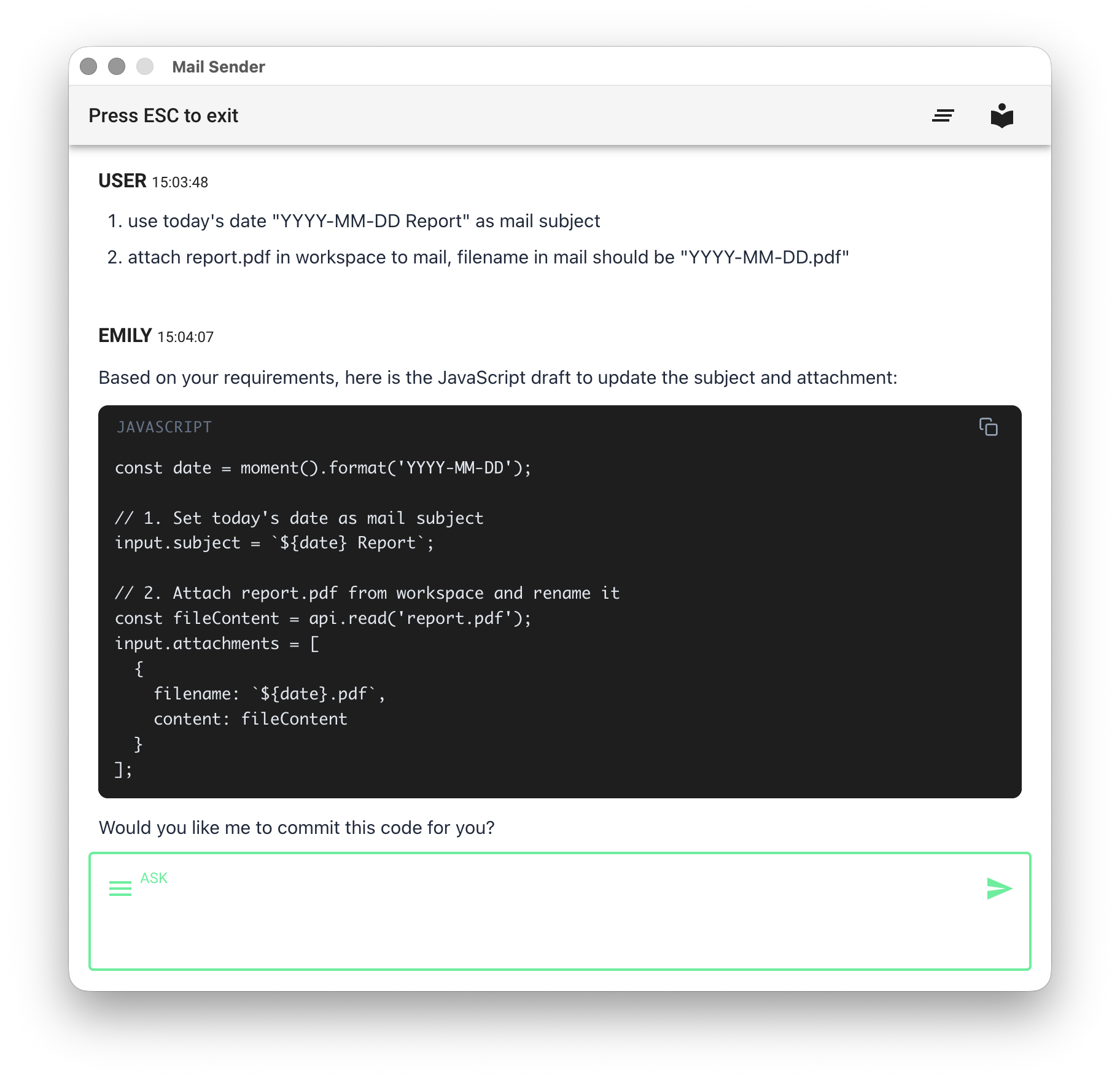 For Low-Code, it is recommended to use "ASK EMILY" to let the AI generate code based on your needs.