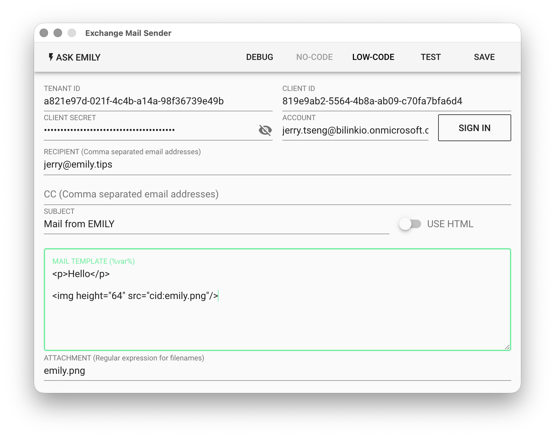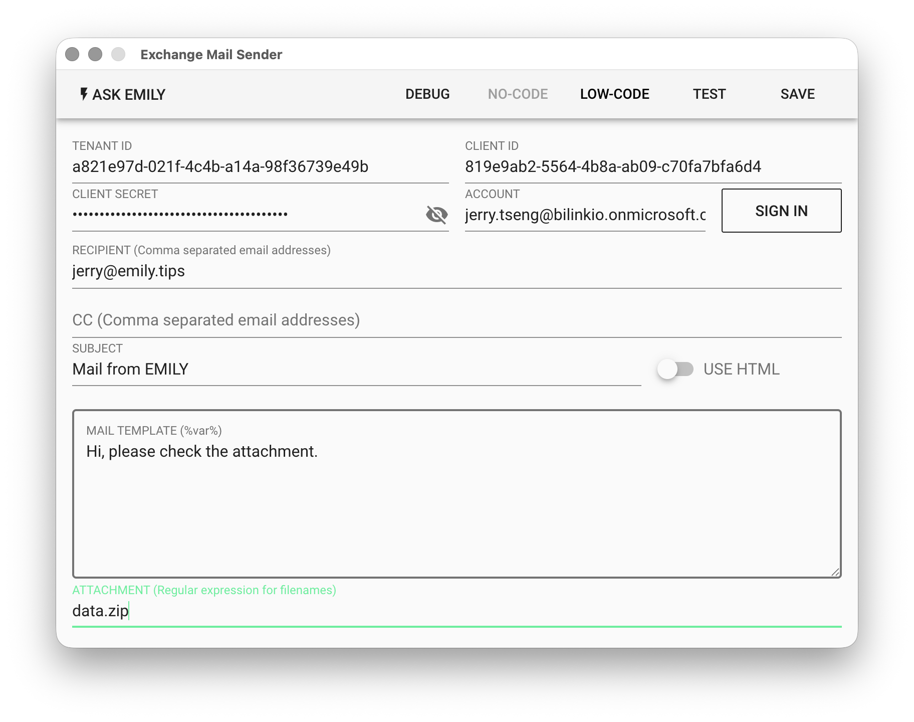 ACCOUNT - After filling in TENANT ID, CLIENT ID, and CLIENT SECRET, click "SIGN IN" to open a browser for user authentication, and the ACCOUNT will be automatically populated.