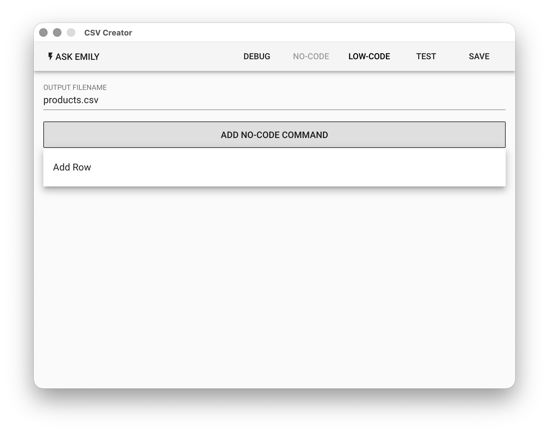 Provides No-Code commands such as: "Add a Record". For example, add a record with the field product set to A4 Paper and the field price set to 100.