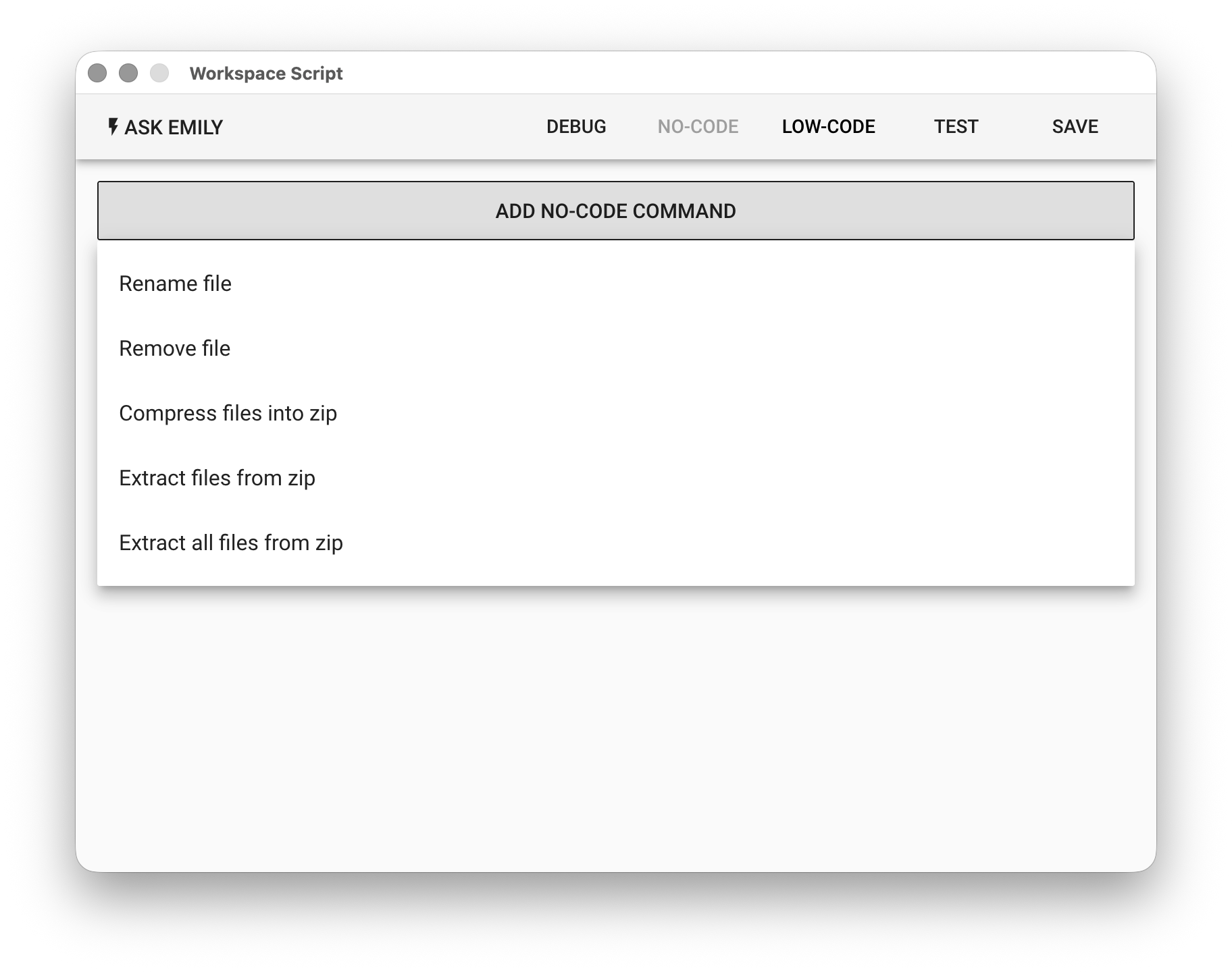 Provides No-Code commands such as: "Rename File", "Delete File", "Compress Specified Files", "Extract Specified Files", and "Extract All Files".