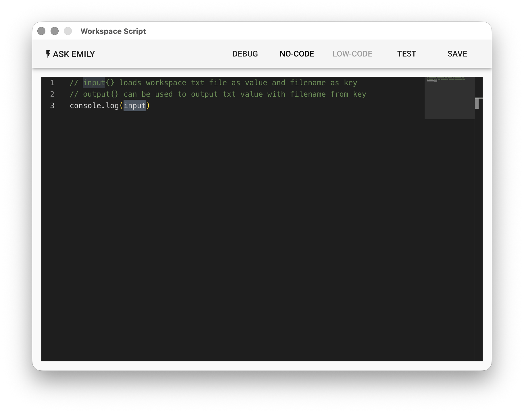 The built-in input object can be accessed directly in the script. Each key in the input object is the name of a TXT file in the working folder (without the file extension), and each value is the text content of that file. When the script is executed, all documents are automatically loaded, eliminating the need to read them manually in the script: