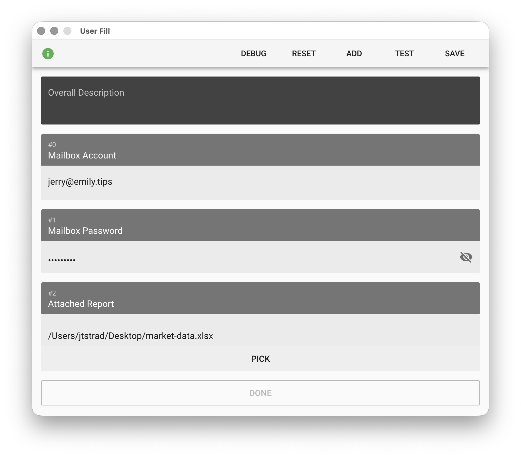 Add a form field item. There are four options: "Text", "Password", "File", and "Folder" — File and Folder let users provide a file or folder path. The item description should help users understand the purpose of the field. In Execution Mode, when the user finishes filling in and clicks "DONE", the module creates text files in the working folder in item order with the filled content, named as userfill(n).txt where n is the item sequence number #n, starting from zero.