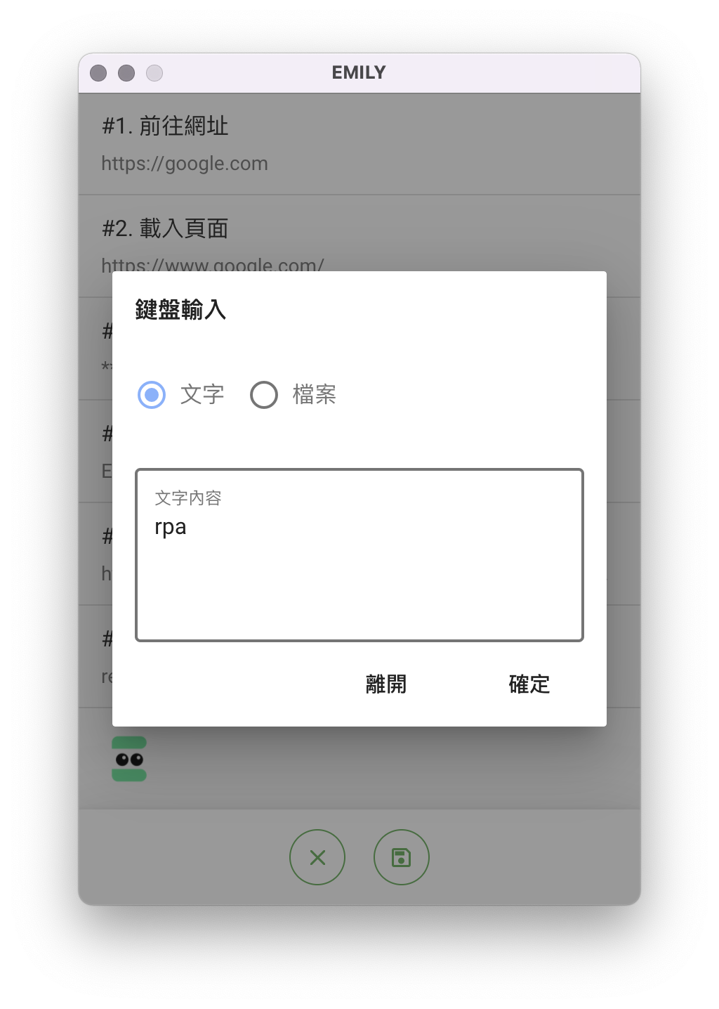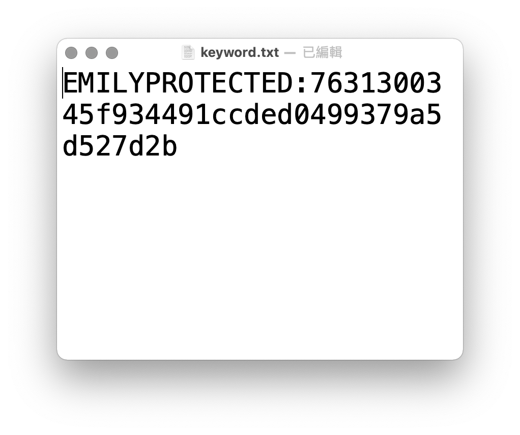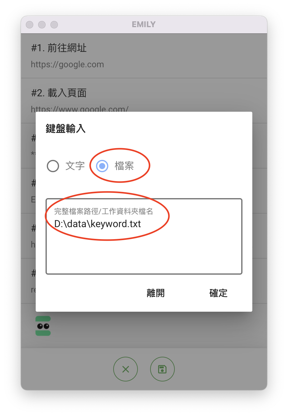 這樣在本地端儲存成參數檔 keyword.txt 時,就會以這台電腦為 EMILY.RPA 提供的加密金鑰加密起來,只有這個 EMILY.RPA 可以讀取原文,使用者需注意被這台電腦加密的參數檔無法被其他電腦的 EMILY.RPA 讀取。