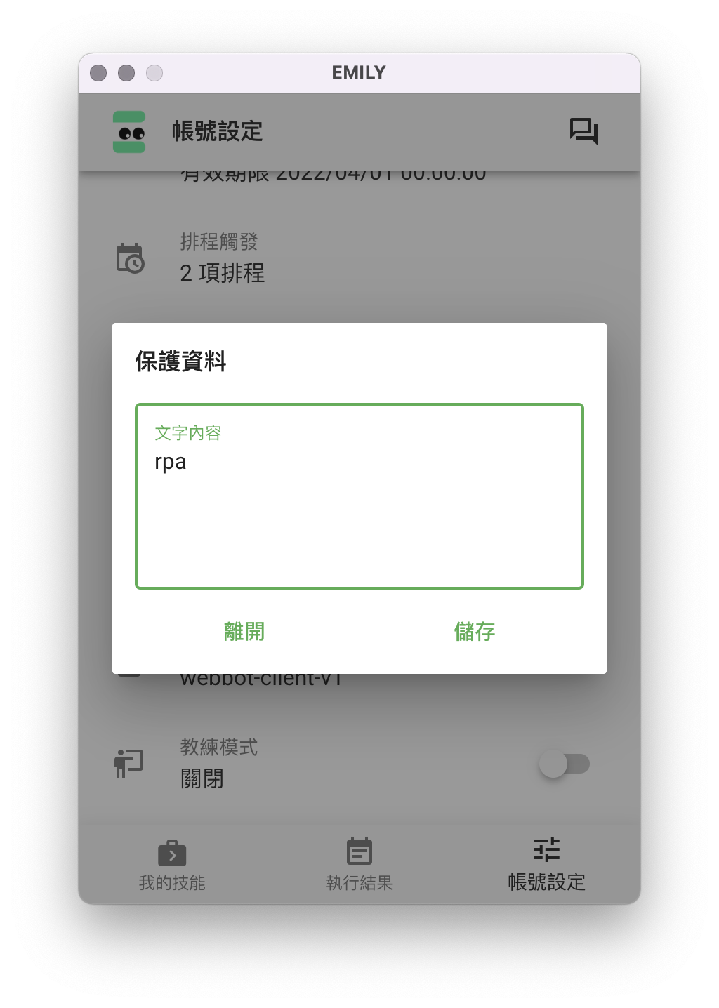 再分離指令與參數後,雲端技能庫保存的已經不會有使用者資料了,但是本地端的參數檔仍然很容易暴露給可以存取這台電腦的其他人,這時可以利用帳號設定裡的保護資料功能,將要保護的關鍵字內容加密起來: