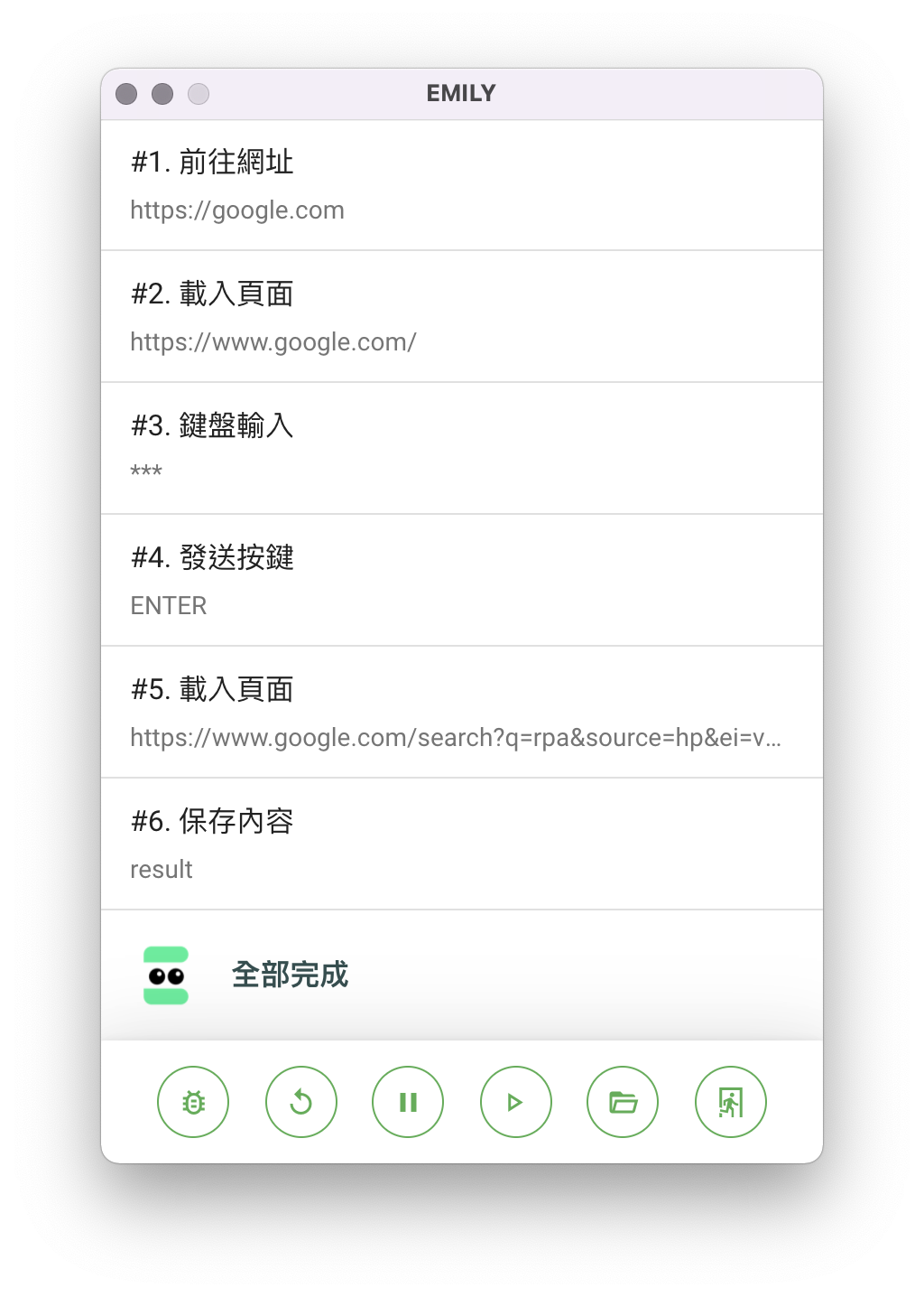 EMILY 的「技能」主要是由流程操作步驟的序列構成,例如到 google.com 搜尋關鍵字然後下載搜尋結果並存成文字檔這個簡單例子,就會是這些步驟的序列:「前往 google」、「載入 google」、「輸入關鍵字」、「按下 ENTER」、「載入搜尋結果頁」、「將結果存檔」。
