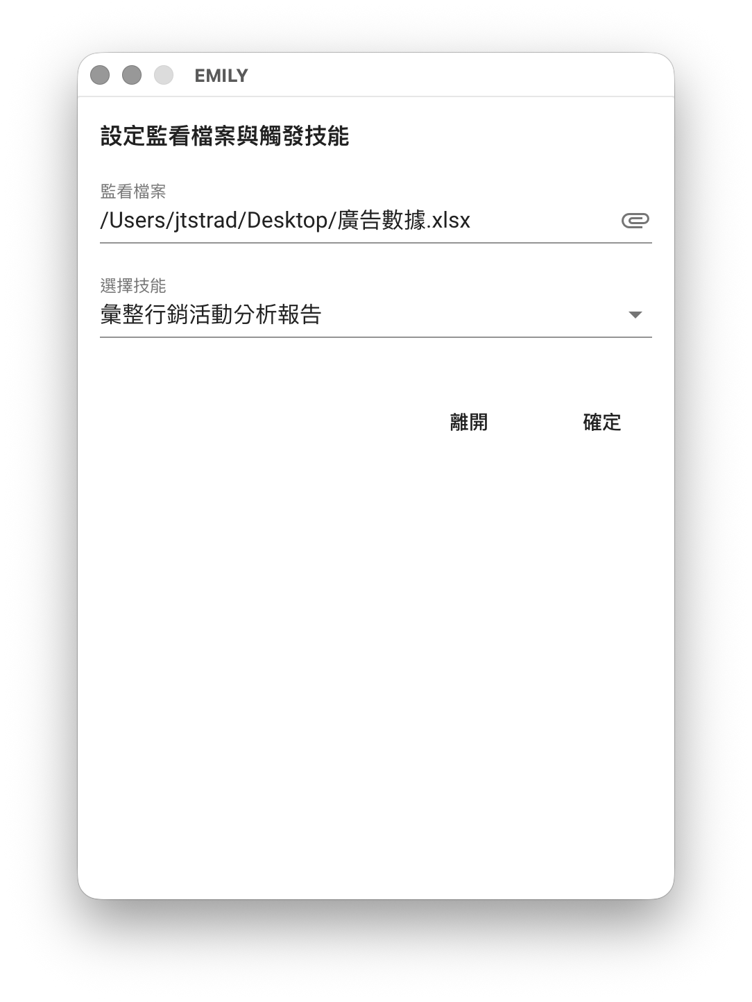 檔案觸發是讓 EMILY.RPA 監看指定的檔案或資料夾,當監看的檔案或資料夾變動時執行指定的技能,變動包含名稱的改變與內容的改變,被刪除也算。