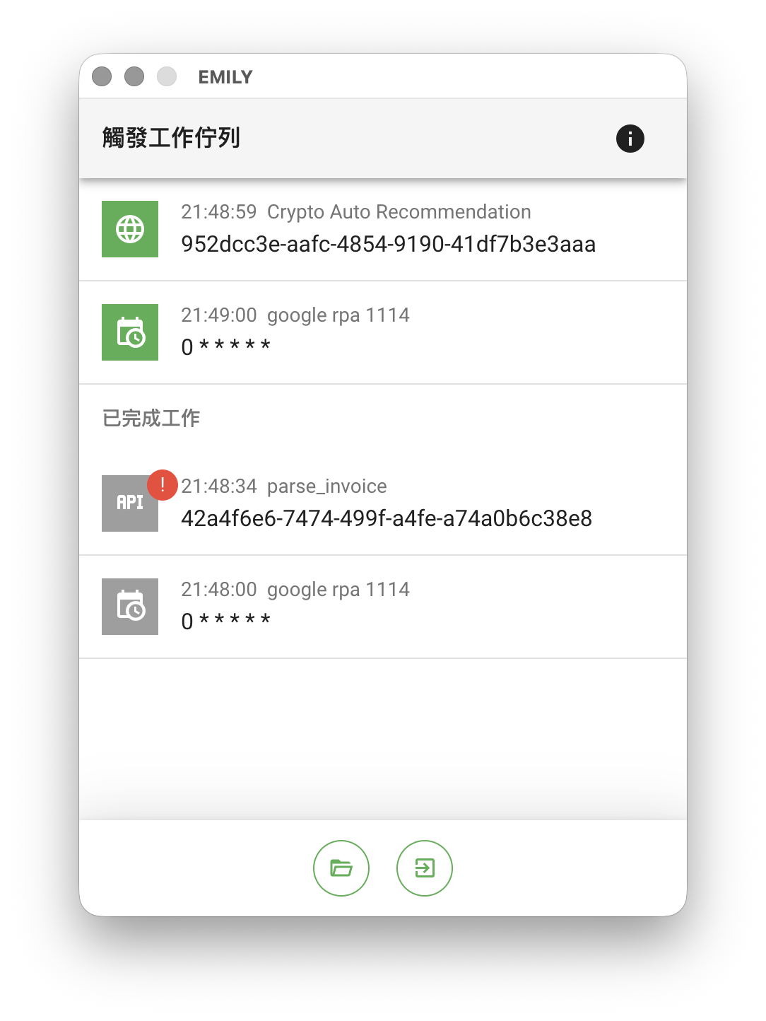 使用者在頁面右上角點擊「啟動」後,EMILY.RPA 就會進入全自動模式,此時設定的各類觸發才會開始運作,「觸發工作佇列」會顯示正在佇列中排隊的觸發技能,第一個項目為正在執行的觸發技能,按照佇列逐一執行,點擊佇列下方「已完成工作」列表項目可以開啟執行工作資料夾。
