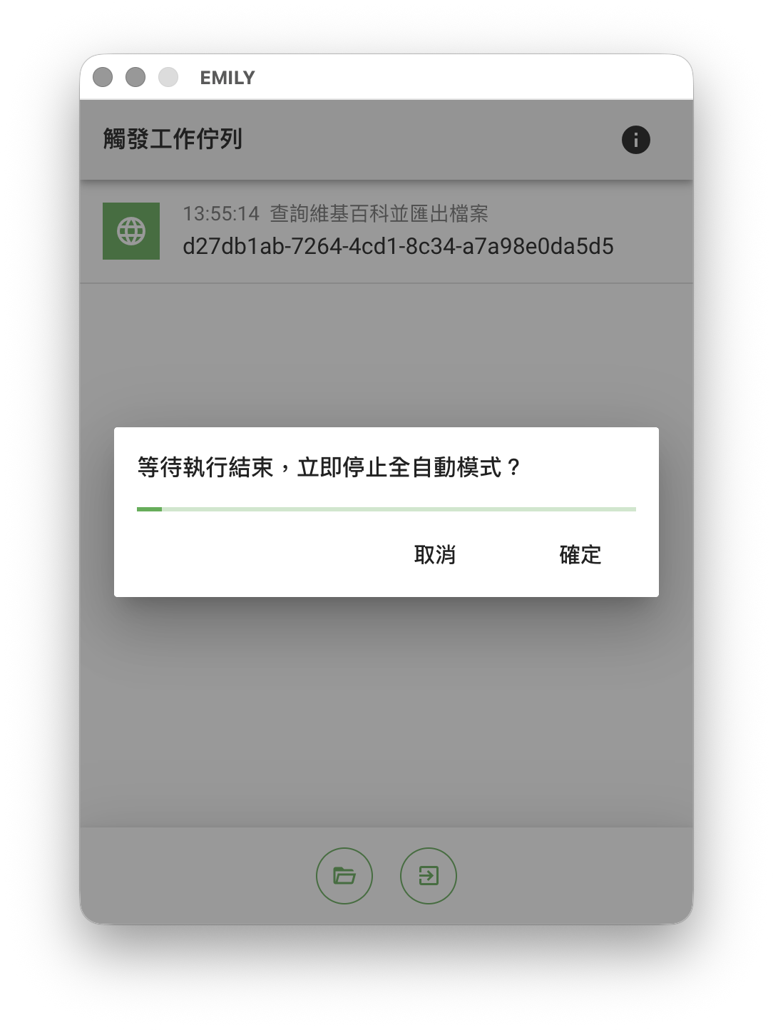 如果點擊「離開」按鈕時有正在執行的觸發技能,使用者可以點選「立即停止全自動化模式」彈窗的「確認」按鈕立即退出全自動模式,否則 EMILY.RPA 會等待正在執行的技能結束才退出,佇列中尚未執行的技能會被保留到下次進入全自動模式繼續執行。