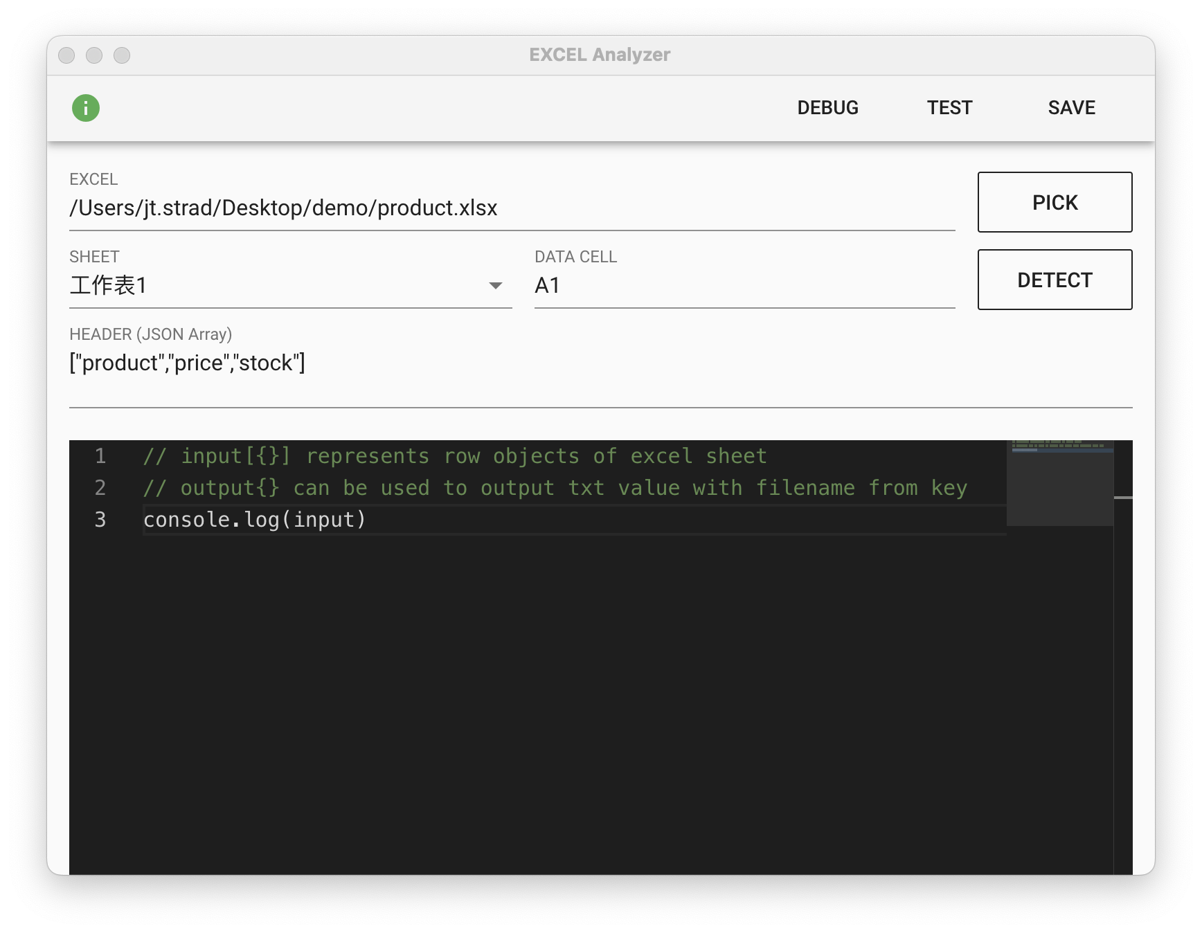 "name": "product" // 將找到的儲存格做為表頭欄位,並命名為”product"