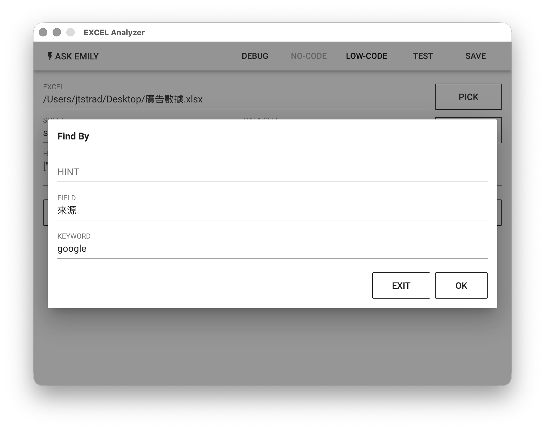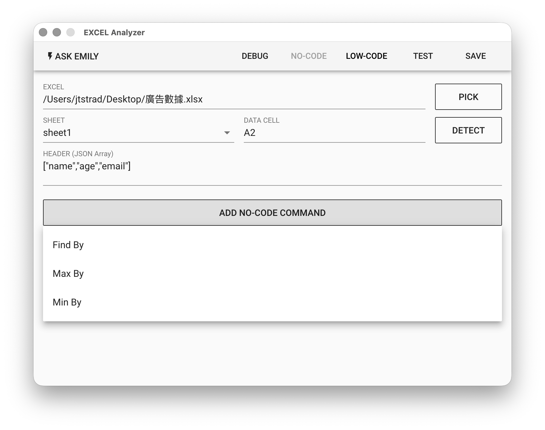 EXCEL表格分析。利用指定表格名、資料起始儲存格、表頭欄位將載入資料正規化,呈現一致的資料結構(input輸入陣列)作為 Low-Code 資料分析來源,結果寫入工作資料夾文檔