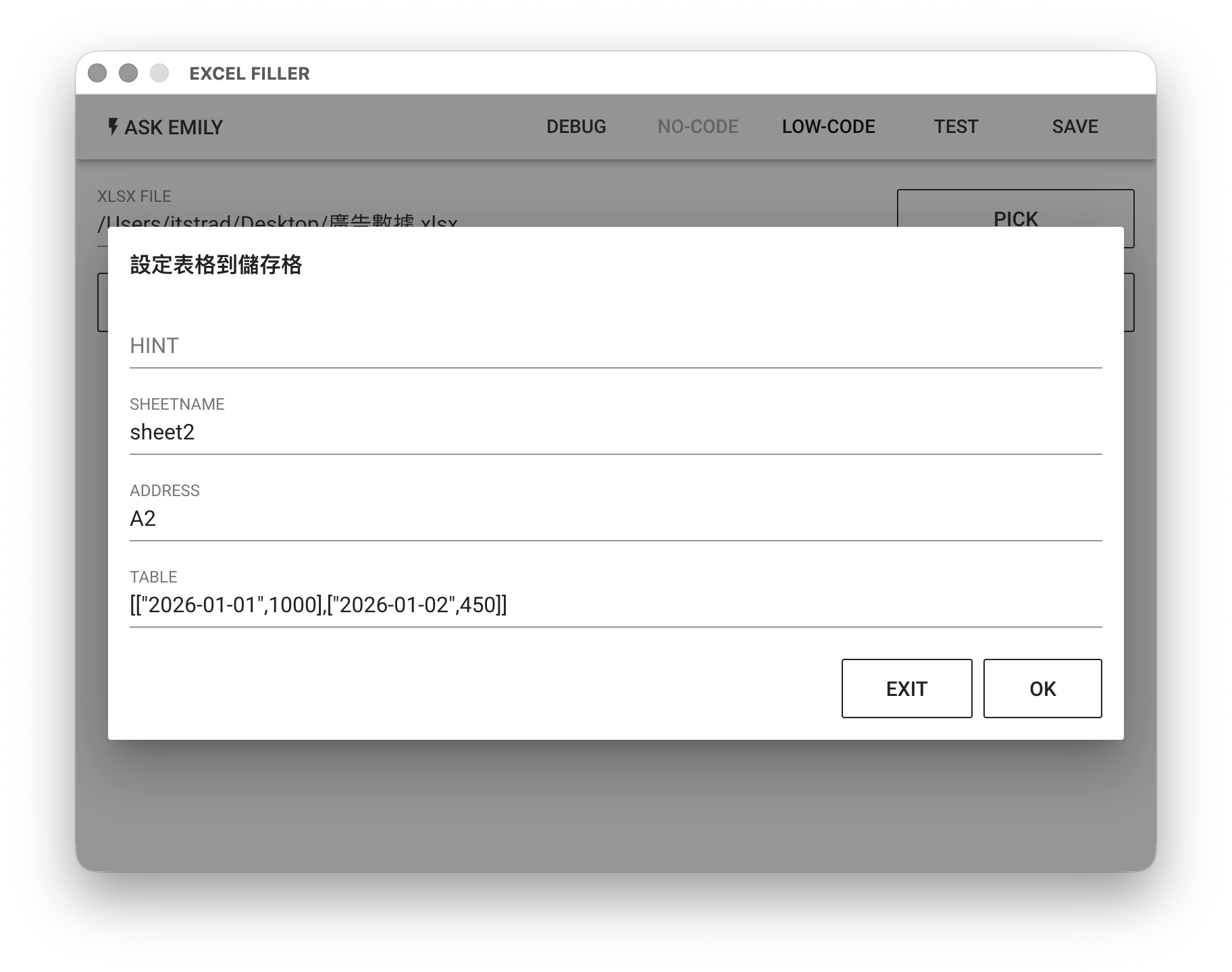 提供:「設定儲存格值」、「設定範圍值」、「設定表格到儲存格」等無程式碼指令。例如,在 sheet2 表格的 A2 位置加入一個二維表格資料,A2 為 2026-01-01、B2 為 1000、A3 為 2026-01-02、B3 為 450。