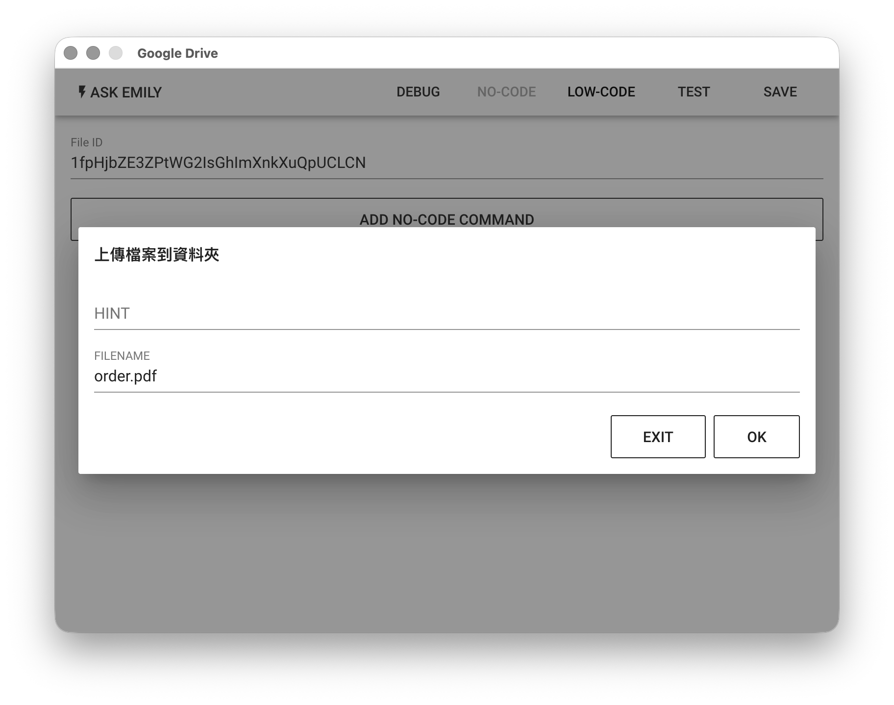 提供:「上傳檔案到資料夾」、「從資料夾下載檔案」等無程式碼指令。例如,將工作資料夾中的 order.pdf 檔案上傳到 Google Drive 指定資料夾。