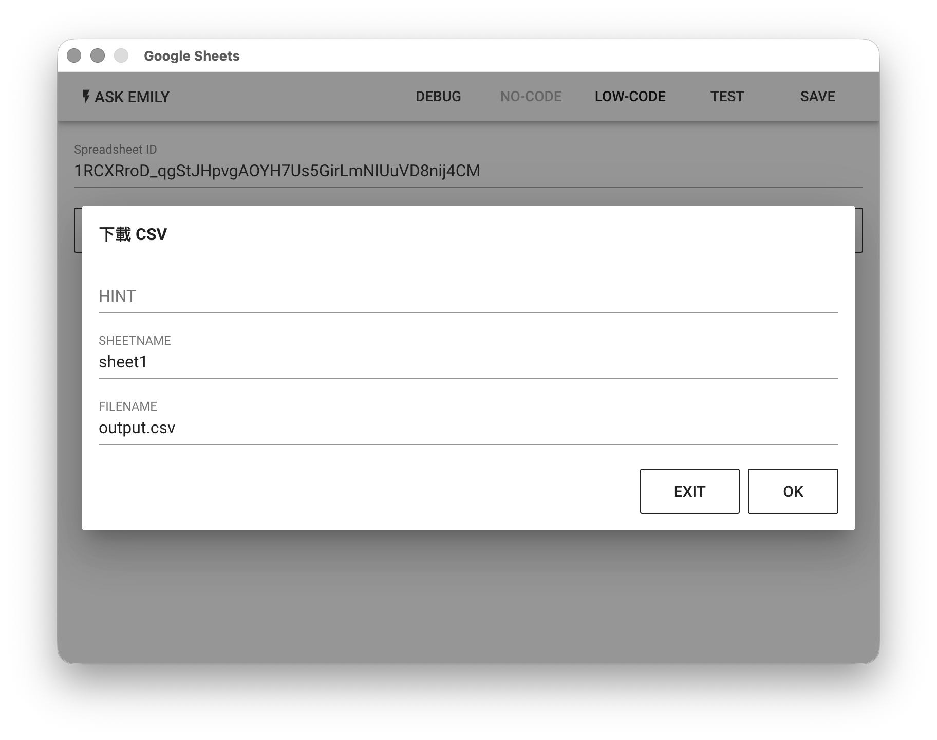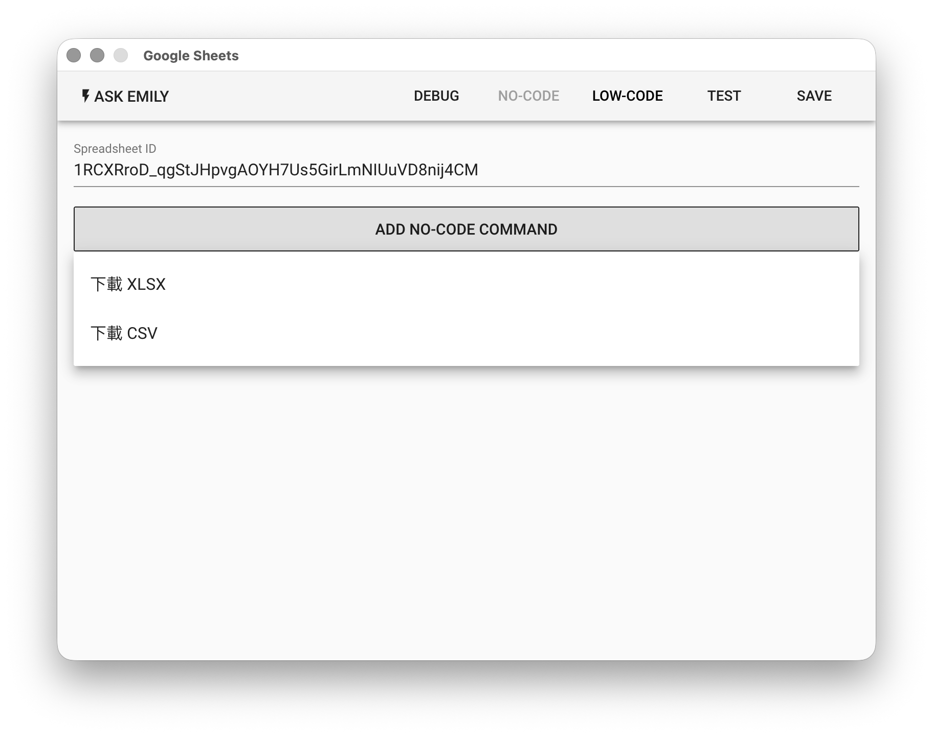 提供:「下載 XLSX」、「下載 CSV」等無程式碼指令。例如,從指定的 Google Spreadsheet 檔案,將 sheet1 表格下載到工作資料夾的 output.csv 檔。