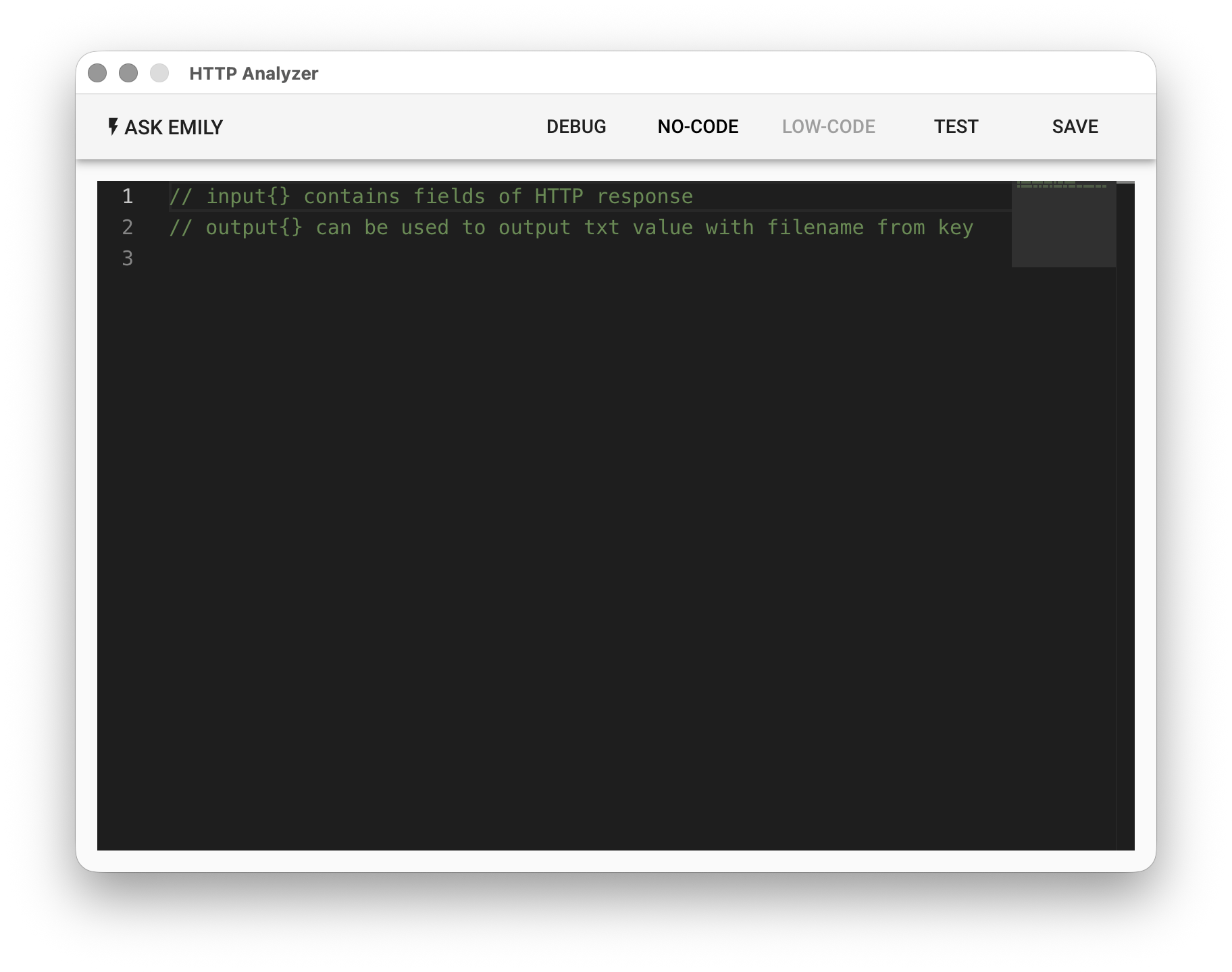 提供:「將回應內容存成檔案」等無程式碼指令。例如,「將回應內容存成檔案」可將回應的 url、status、headers、contentType、body 寫入工作資料夾中的文檔。