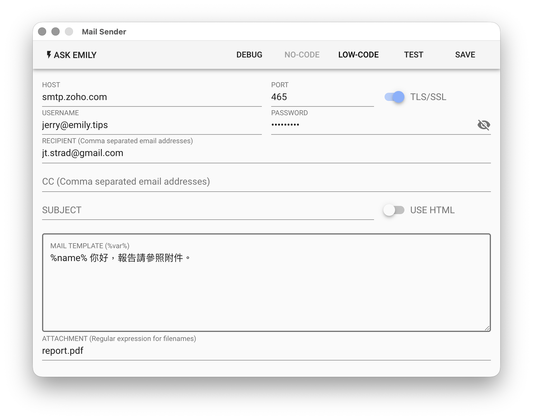 絕大多數的模組都提供 No-Code 無程式碼編輯器,可以編輯模組參數或指令。以「發送電子郵件」模組為例,如果規則標準沒有太多變化,使用者可以在 No-Code 編輯器直接設定電子郵件信箱的參數。如果欄位提示出現 %VAR% 或 %FILENAME% 表示這個欄位接受變數,其中變數名稱對應到工作資料夾中的文檔的主檔名。例如:%name% 的內容會被工作資料夾中 name.txt 的檔案內容取代。