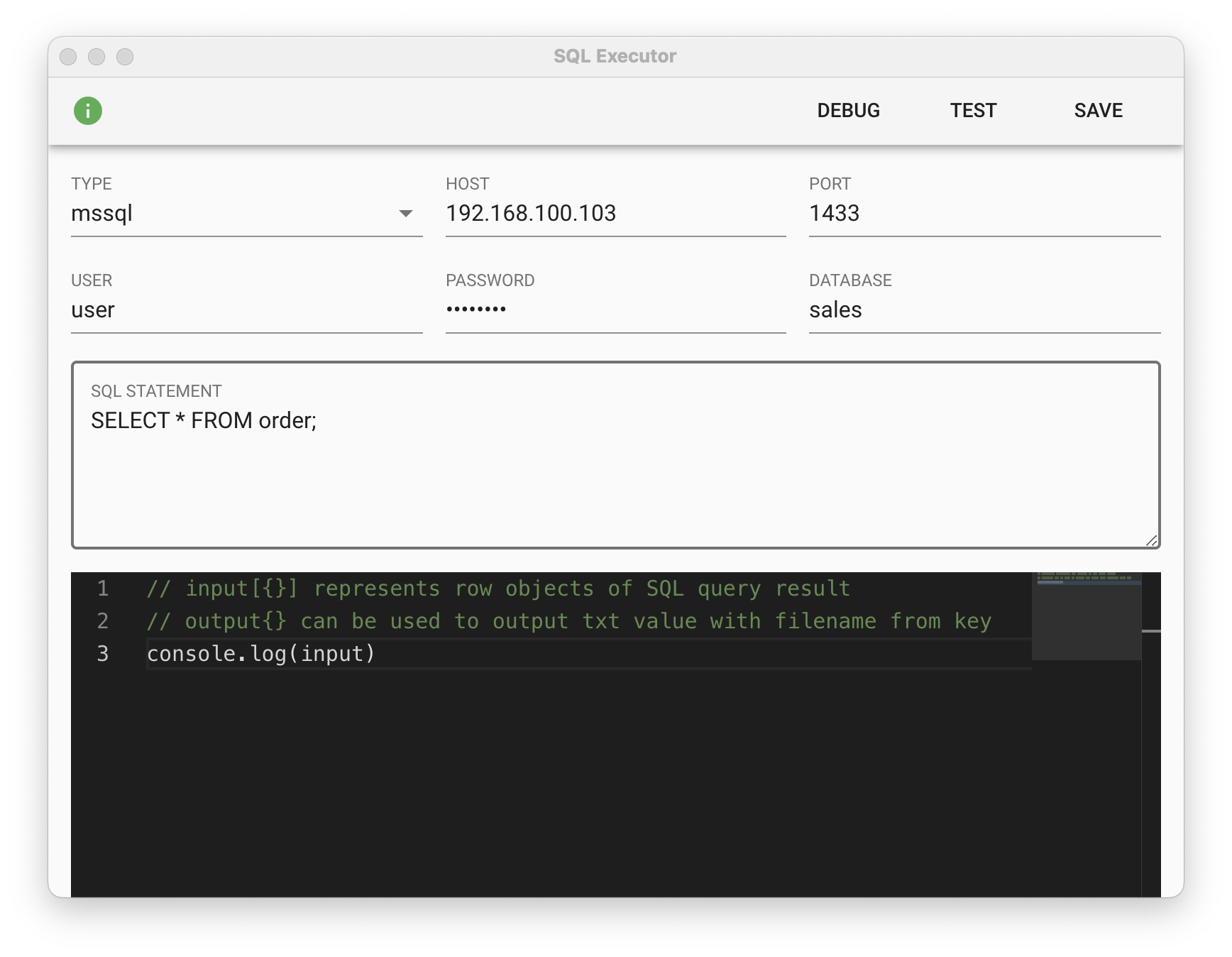 在 input 陣列中的每個元素代表 SQL 查詢到的每一筆資料,物件中的 key 為查詢表格的欄位,value 為該欄位在這一筆資料的值。