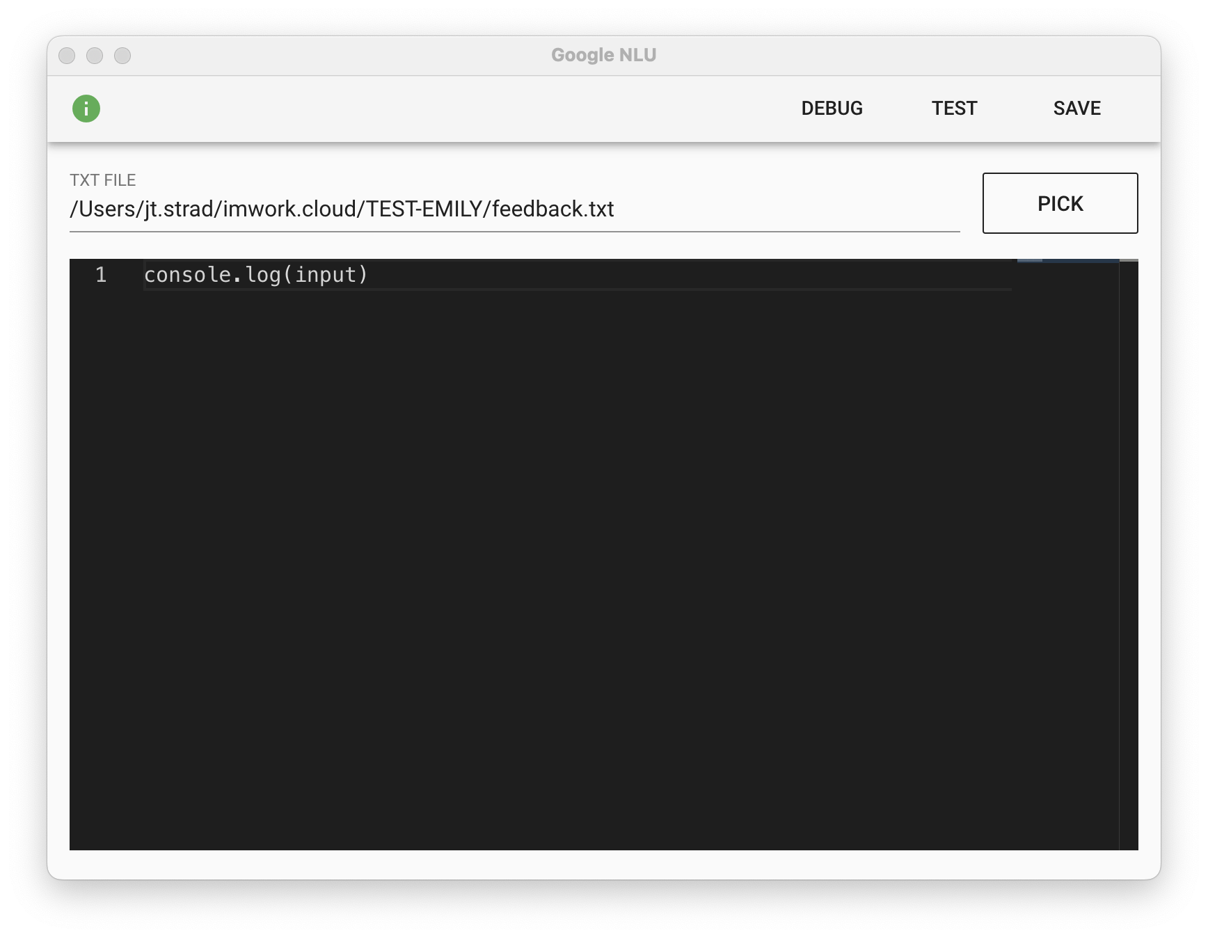 自動化模組Google 自然語言理解本頁導覽Google 自然語言理解 使用 Google 雲端 NLU 服務,解析文字檔案中的正負面情緒與強度,input 為 NLU 解析回傳的結果 TXT FILE 文字輸入檔,點擊 PICK 選取檔案、鍵盤輸入工作資料夾中的檔名,或使用 %FILENAME% 變數。
