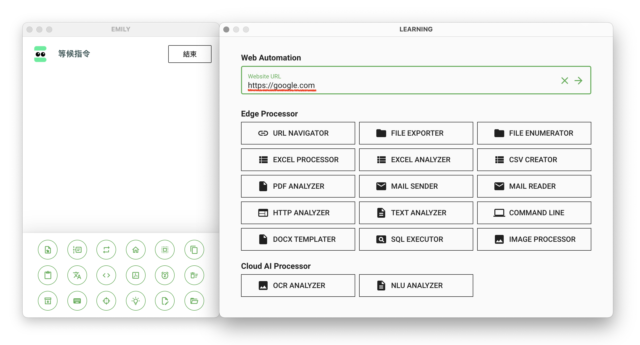 你將發現 EMILY 機器人正在紀錄你在 Google 搜尋首頁上的操作步驟,例如前往 https://google.com 網址,載入 https://google.com 頁面,用鍵盤輸入 RPA 等,這個過程就是 EMILY 的 No-Code 訓練。接下來請點擊主視窗的結束按鈕告訴 EMILY 訓練結束了,瀏覽器視窗會被關閉,你將看到如下圖的畫面:
